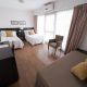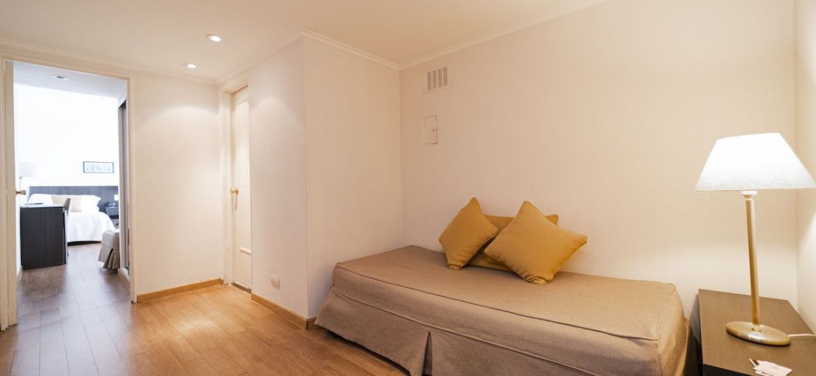 Quarto de 2 ambientes, com 2 camas twins ou uma cama de casal em um dos ambientes mais uma terceira cama na sala de estar / escritório.